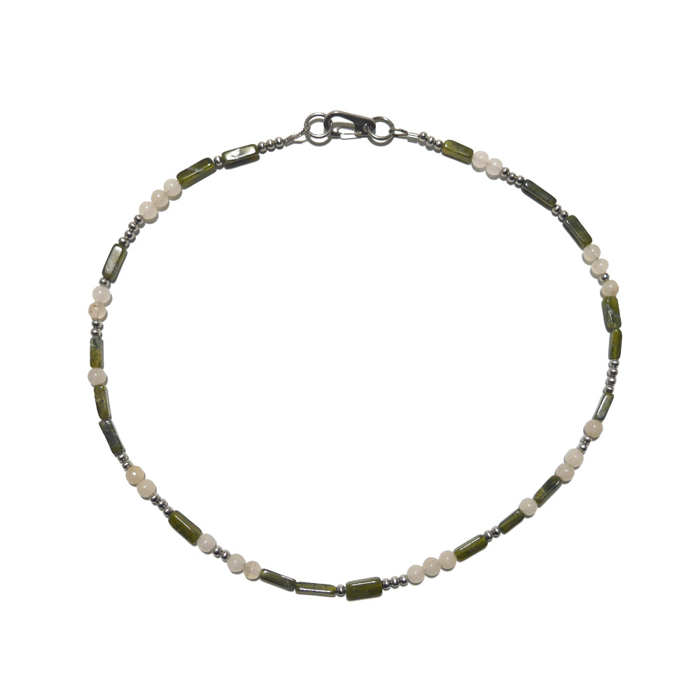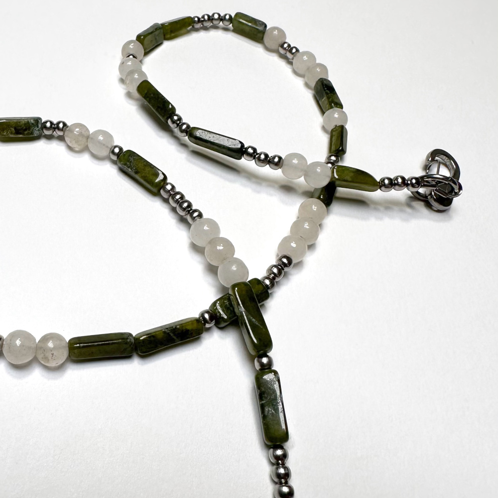 vesuvianite, quartz, stainless steel. 17.5″.