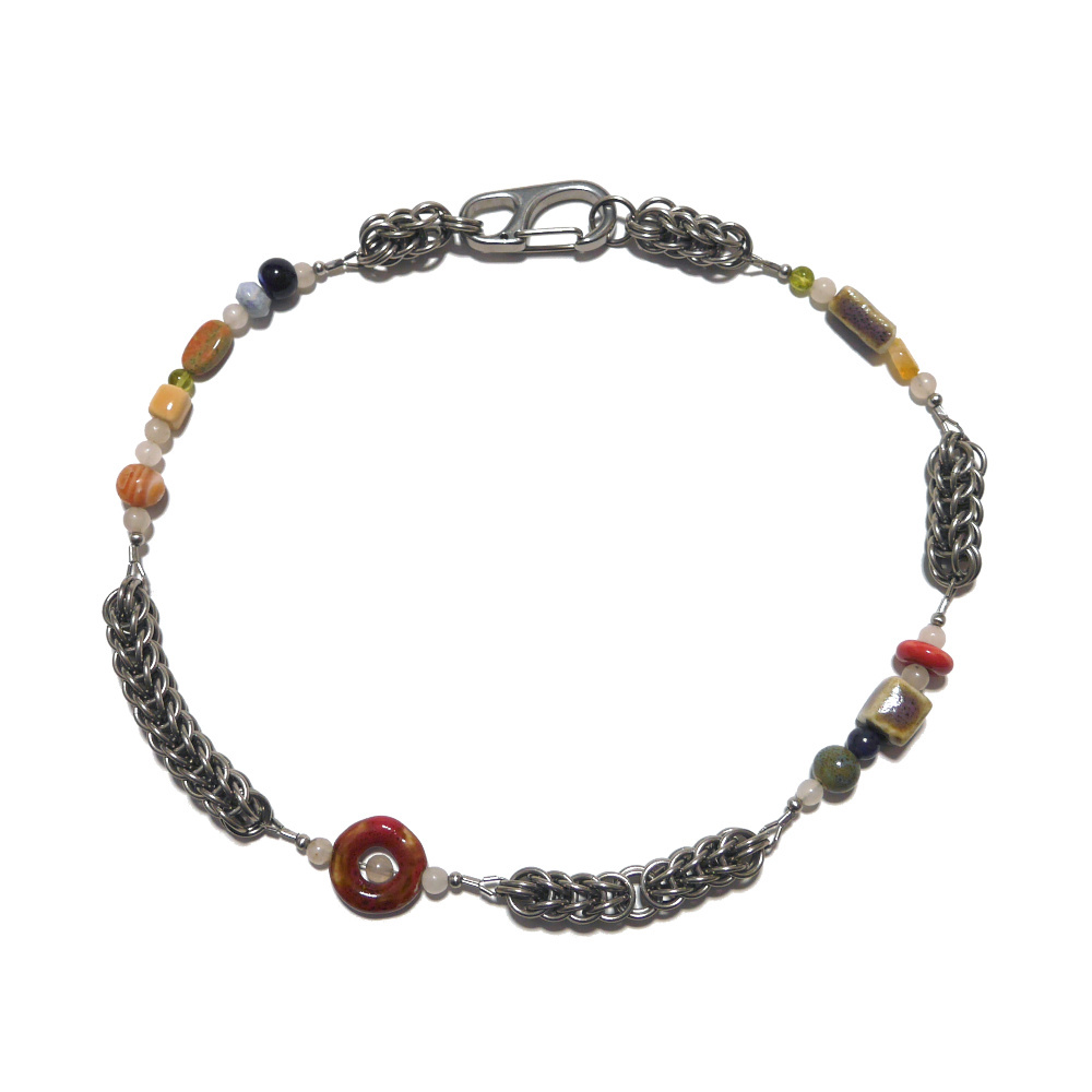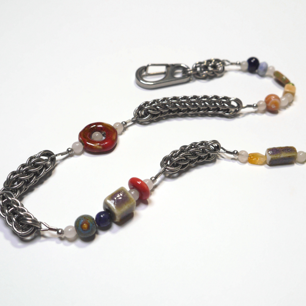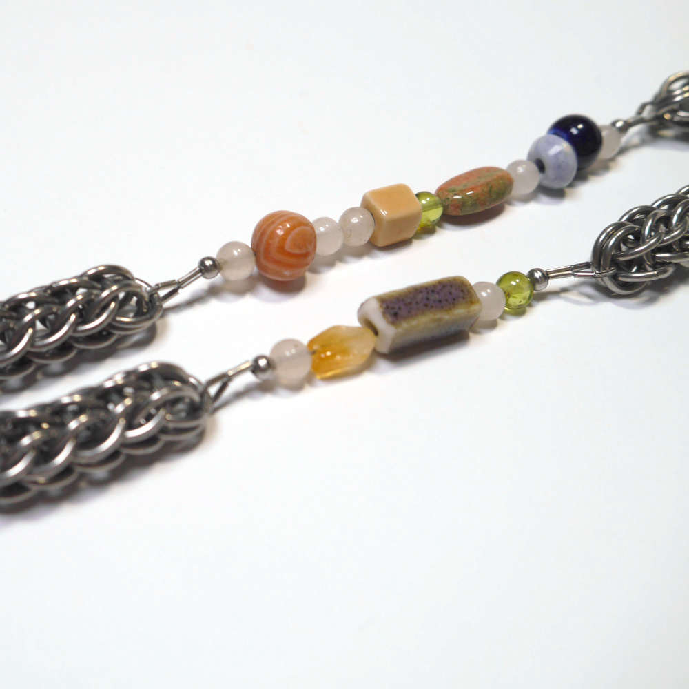 quartz, agate, peridot, unakite, sodalite, citrine, ceramic, stainless steel. 19″.